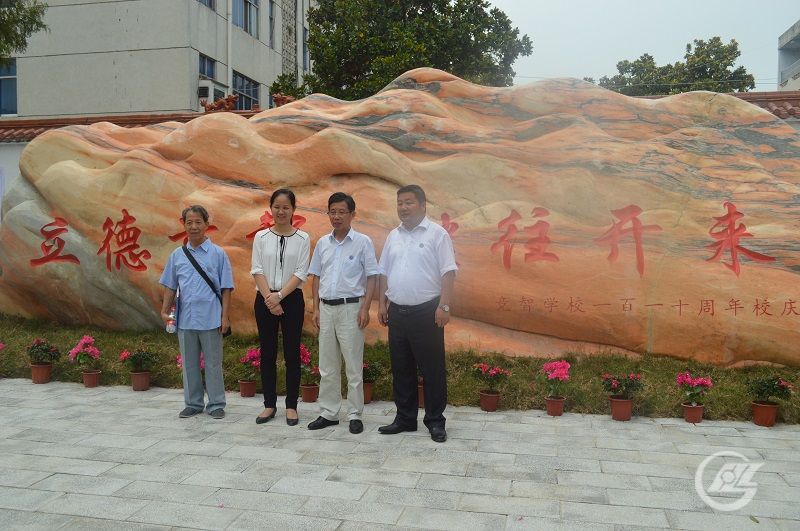 從左往右依次為:中南財經(jīng)政法大學(xué)教授屈演文、王城鎮(zhèn)黨委書記李黎、盛隆電氣集團(tuán)董事長謝元德、市委常委宣傳部長柯紅勇,在刻有校訓(xùn)的紀(jì)念石前合影