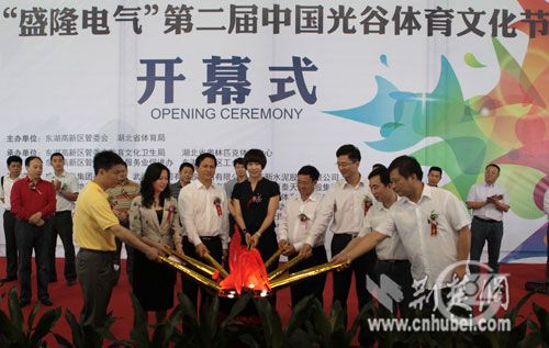 武漢東湖新技術(shù)開發(fā)區(qū)教育文化衛(wèi)生局局長(zhǎng)錢德平主持開幕式。省體育局副巡視員劉林芳、盛隆電氣集團(tuán)有限公司總裁謝洪潮、武漢市體育局副局長(zhǎng)陳林祥、東湖新技術(shù)開發(fā)區(qū)管委會(huì)副主任孫茜雯先后致辭。隨后,出席開幕式的省體育局領(lǐng)導(dǎo)和東湖新技術(shù)開發(fā)區(qū)有關(guān)部門領(lǐng)導(dǎo)共同點(diǎn)燃“圣火”,啟動(dòng)第二屆中國光谷體育文化節(jié)。