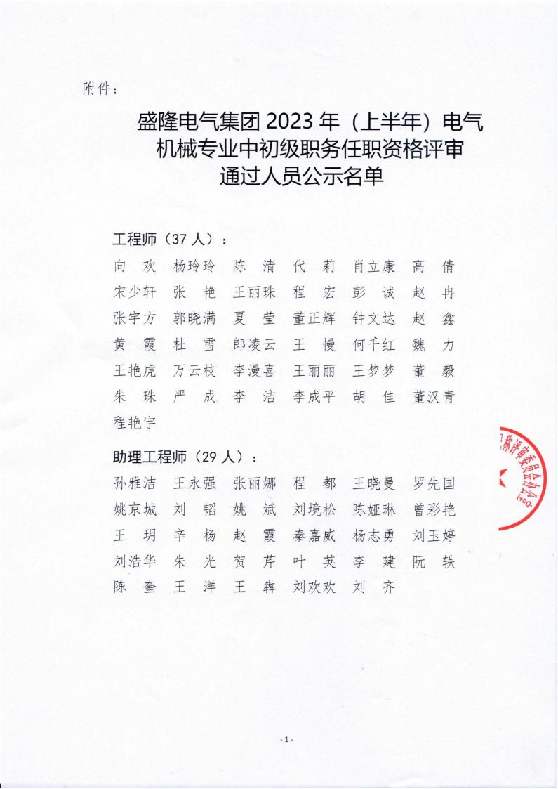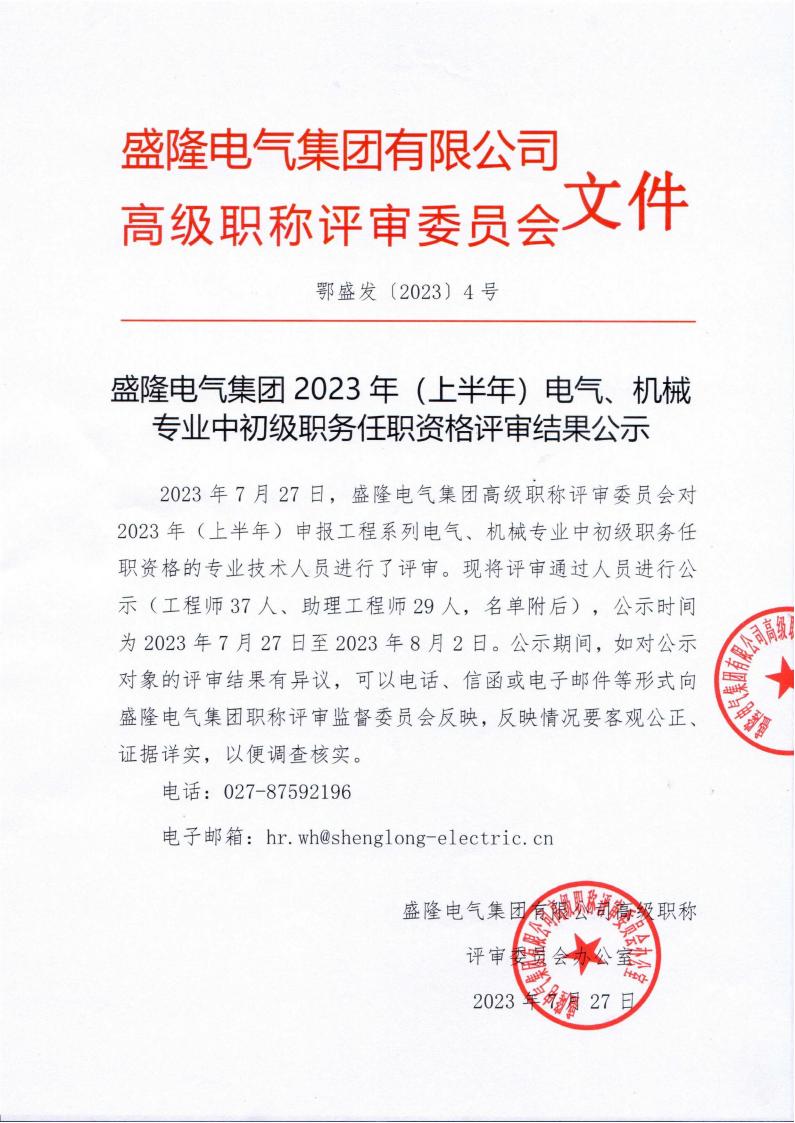 盛隆電氣集團2023年(上半年)電氣、機械專業(yè)中初級職務(wù)任職資格評審結(jié)果公示