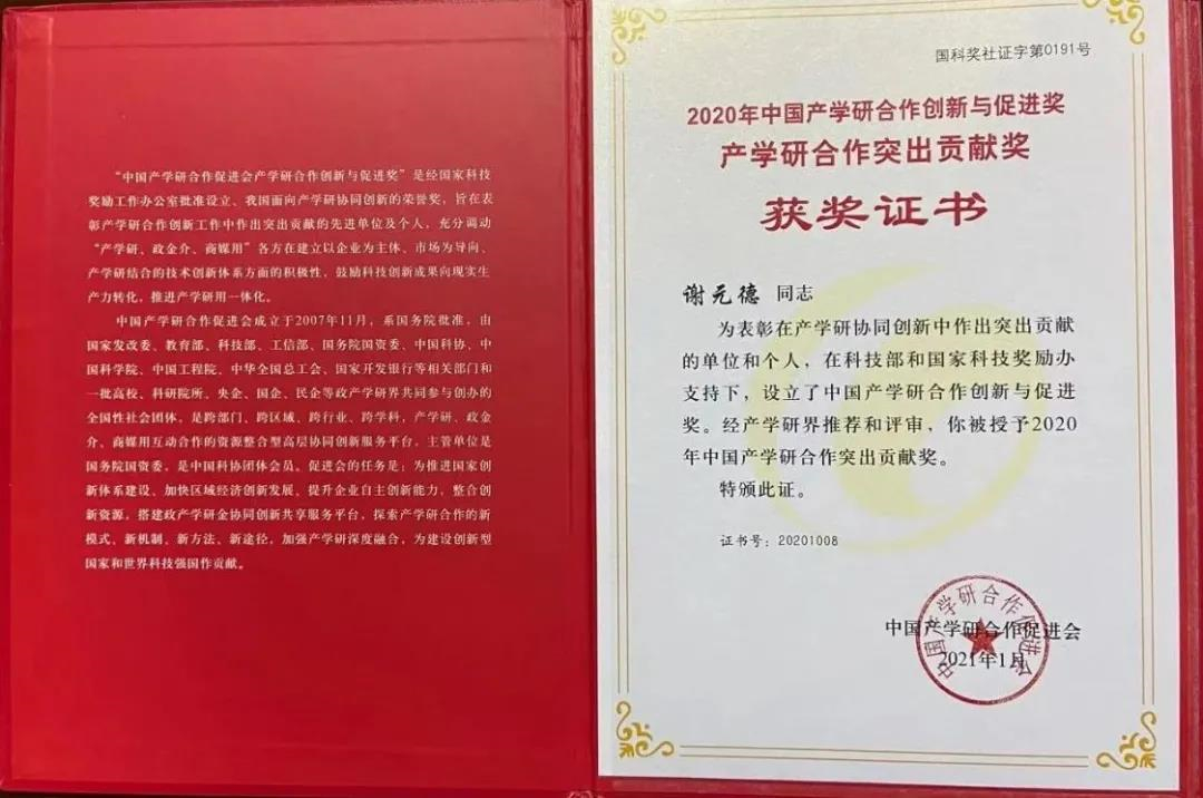 盛隆電氣董事長謝元德榮獲2020年中國產學研合作突出貢獻獎